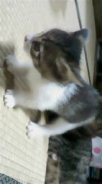 黒虎、茶虎、白のぶち猫です。少しからだが小ぶりです。親たちにするとほおっておけないようでなくとすぐにおどおどしちゃいます。