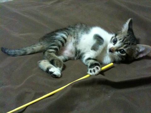 キジトラ白の女の子でしっぽ真っ直ぐ。