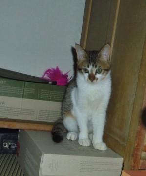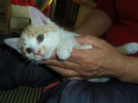 メス猫花ちゃんは生後1か月半(推定)の茶白、何でも興味がある、お転婆娘です。尻尾はスラーとまっすぐです。