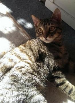 キジトラ(全身キジトラ模様、シッポは長め)、お口の周り白。