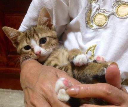 茶色混じりのキジトラさんです。すごい食欲で元気いっぱい、お腹ぽんぽんです。
