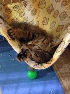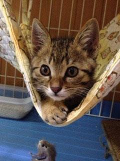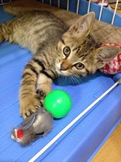 仮称「チビトラ君」です。元気なキジトラの男の子です。キジが細かい模様です。尾はスラッと長く、スリムな体型をしています。顔が小さくて目がクリクリしているのでとても子猫らしい可愛い顔をしています。
