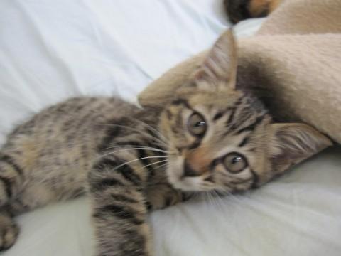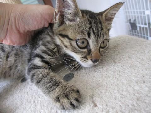 まんまるお目目のころころしたかわいいきじとらいぶきくんです。とても人なつこくかまってくんの甘えん坊です。甘えたい時に相手をしてやらないと肩まで登って来て催促をします。大変元気でやんちゃ、走る時は欽ちゃん走りです。他の猫ちゃんにもフレンドリーです。