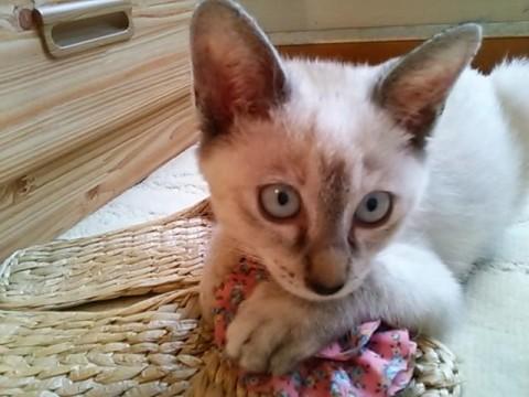 シャム系の雑種です。鼻の頭が真っ黒で、目はうすいブルー。しっぽの先は縞。手足も薄い縞模様です。大きくなると、薄い色の部分がもう少し濃く出るかもしれません。シャムは細身の小顔が特徴らしいですが、この子猫も同じで、手足がスラッとしてます。