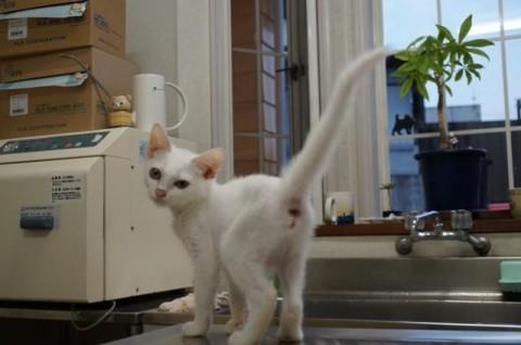 保護した時には身体も小さく、頭は大きく傾きうまく立てない状態でしたが、その後治療の結果、普通の生活が出来るようになりました。呼ぶと首をかしげながら走ってくる姿はとてもいとおしくなります。このまま病院猫として育つよりも、愛情のあるお家で普通の猫として面倒を見てもらえればと里親募集をいたします。