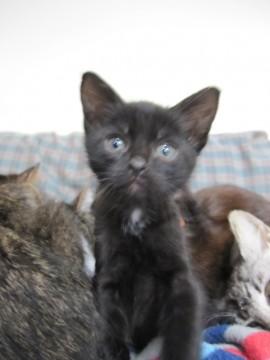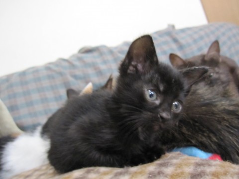 かわいい黒猫のこんぶちゃんです。のどにほんの少し白い毛があります。性格はとても人なつこく、4匹の中でいちばん活発で好奇心旺盛です。トイレしつけ済み