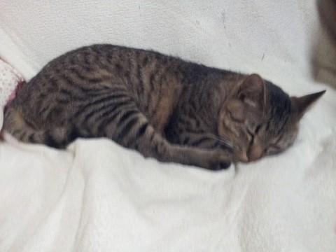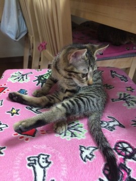 キジトラで 月齢の割には小柄です。