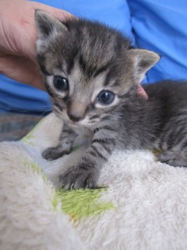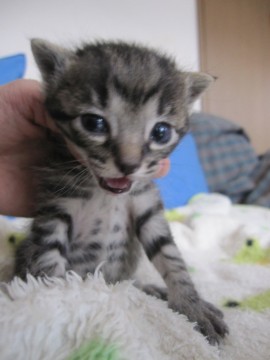 かわいいきじとらのなでしこちゃんです。まだ小さいので性格等ははっきりわかりませんが、ミルクから育てるので大変人なつこくなります。