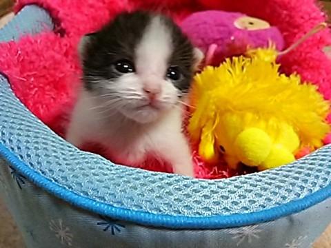 ゴミ収集車の職員さんに保護された後、飼育が難しいとのことで私共で預かりミルクボランティアさんにお願いし保護しています。