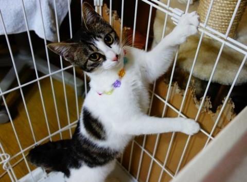 当初はとても怖がりちゃんで、おどおどしてました。でも、来た当初からご飯はモリモリ食べるし、トイレもしっかりしてたので、安心してました。怖がりといっても、噛み付いたり、引っかいたりとかの攻撃性は全くありません。今はケージにいることもありますが、ケージの外に出るとウチの猫たちとリビングで一緒に元気に遊んでいます。慣れれば、撫でることも、ダッコも爪切りも大丈夫です。