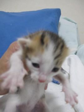 とってもかわいいしま三毛、にいなちゃんです。まだ小さいので性格等ははっきりわかりませんが、とても元気でミルクから育てるので大変人なつこくなります。