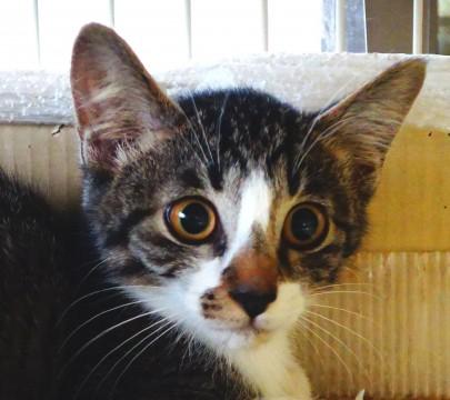 キジ白の柄で目はグリーンでパッチリなのが、チャームポイント。