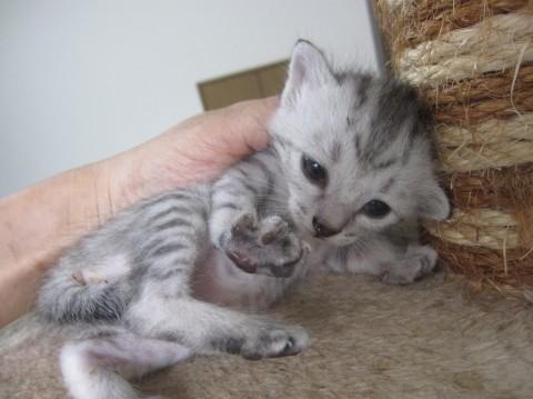 可愛いサバとら、びばちゃんです。まだ小さいので性格ははっきりわかりませんが、ミルクから育てているので大変人なつこくなります。