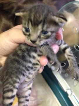 サバトラの赤ちゃんです。まだ保護して間もないため、哺乳瓶を受け付けないため、カテーテルにて直接ミルクを異に流し込んでいます。