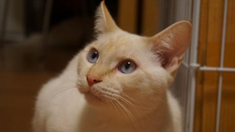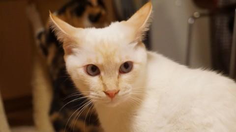 全体が白 耳先、尻尾はクリーム色 青い目 長尾