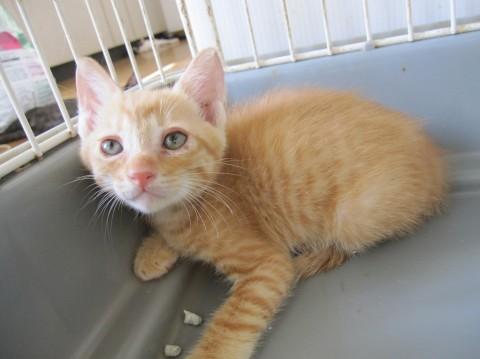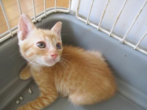かわいい茶トラ、シンバ君です。ちょっとたれ目の困り顔がとってもかわいいです。最初は威嚇していましたが、まだ小さいのですぐに慣れてくれました。今はとても人なつこく他の猫ちゃんにもフレンドリーです。