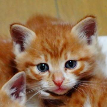 目はベビーブルーで尻尾はまっすぐな、お顔の大きい茶白の男の子です。