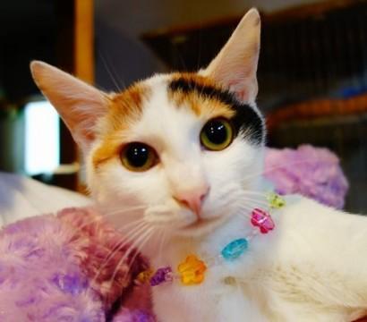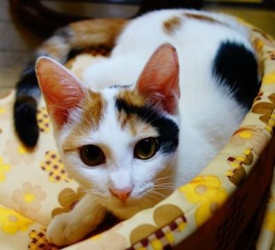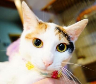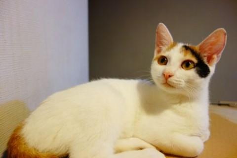 小柄な子猫ですがお目目ぱっちりの、綺麗な顔立ちの白の多い三毛猫です。