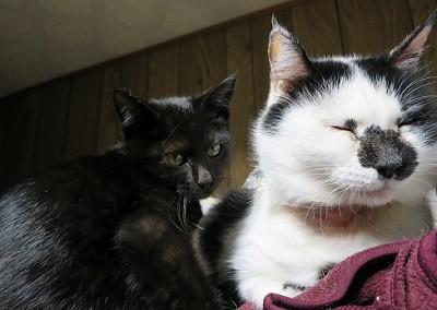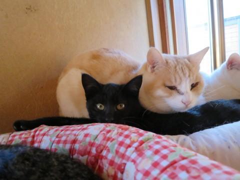 遊ぶ相手がいないのでひとりで遊びます。眠くなると、大人猫の脇へ行きます。