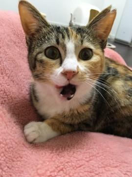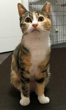 三毛柄もシマシマ柄もハチワレ部分もなが~いシマシマ尻尾も持っている、欲張りなシマ三毛ちゃん♪