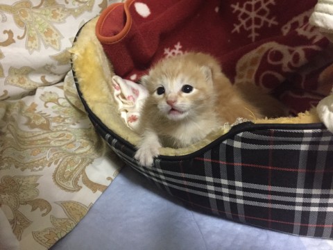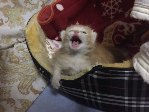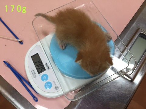 保護時まだ生後10日で心配でしたが、3〜4時間おきのミルクとオシッコだしをして、日に日にミルクの量も増えてて、元気いっぱいにミャ〜ミャ〜泣いてます