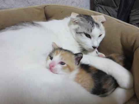 親猫は耳折れの雑種で、よく飼いならされているようです。