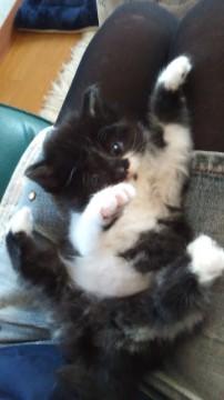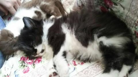 ほかの兄弟と母猫は毛の長さが普通なのですがこの子のみ毛が長いようです。少し毛の長い子になることが予想されます。フワフワで子犬のように見えますがちゃんと猫です。