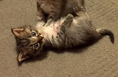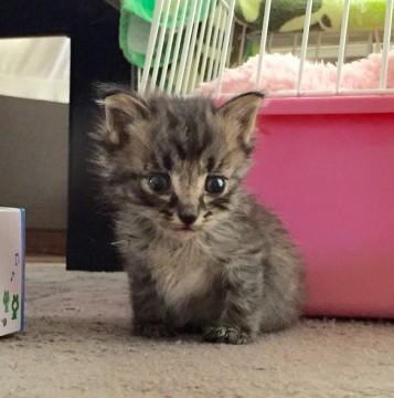長毛のキジトラで顔以外はシマがあまりハッキリしていません。少し 臆病ですが、食欲モリモリで 兄弟猫と遊んだりケンカしたり元気いっぱいです。トイレもパウチのご飯食べるのも上手です。とても お利口さんです。