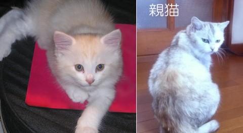 5枚目(左)は同時募集の兄猫、(右)は親猫で白に薄いグレーと薄クリームの三毛ですが日本猫ではなさそうです。