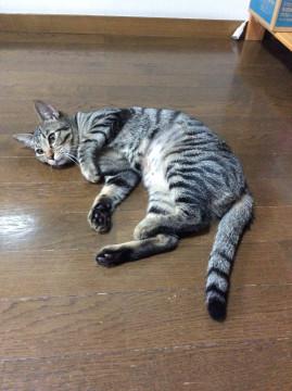 黒の多いサバ猫さんです。シッポは、長くてまっすぐです。
