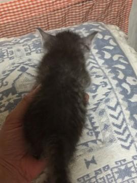 濃いグレーに少しキジが入っています。尻尾は長く真っ直ぐで、キジ柄です。