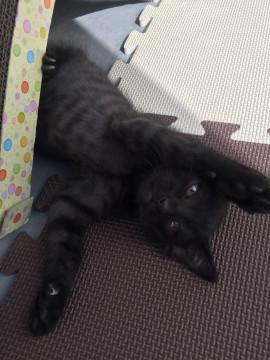 黒地にうっすらトラ縞柄の黒猫ちゃんです。元気に兄妹と駈けまわっています。やんちゃな性格の男の子です。