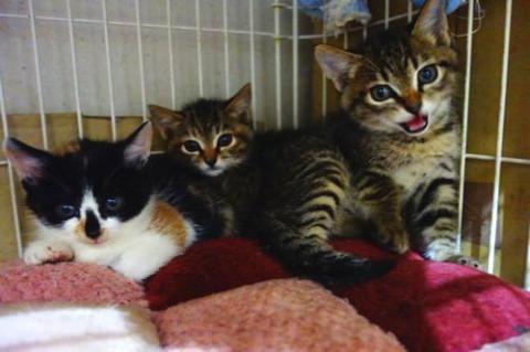 そっくりな、美形キジトラ子猫はどちらもオスでま~ちゃん、ろ~ちゃんと仮名を付けました。三毛猫はプリンちゃんと仮名を付けました。怖がってしゃ~しゃ~言ってましたが、最初から触ることが出来ました。最近は、ご飯が欲しくて一生懸命アピールしてます。あと少しでかなり人なれが出来ると思いますので、里子に行った先で慣らしていただきたく里親募集を始めました。