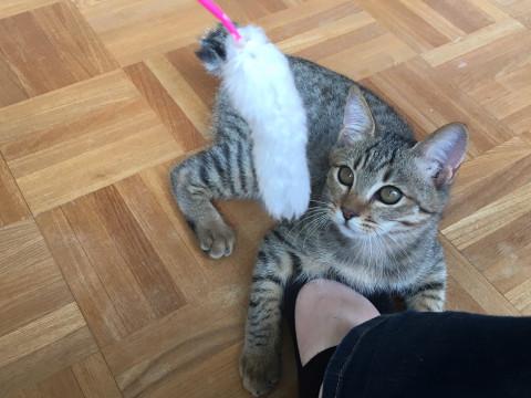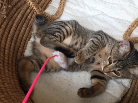 活発で遊びが大好きです。じゃらしを見せると すぐに飛びついてきます。自分でじゃらしを加えて持ってきて遊びを要求することもあります。
