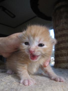 可愛い赤ちゃん茶トラ、ふぁらお君です。小さいのでまだ性格はわかりませんが、ミルクから育てるので大変人懐こくなります。
