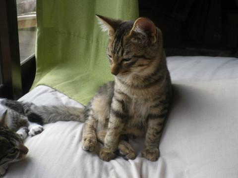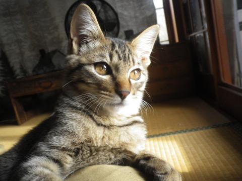 全身シマシマのキジトラの子猫です。母猫は小柄なうす三毛・父猫は不明
