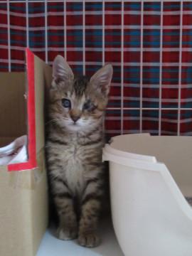 風邪から目がやられ、障害がありますが、性格は活発で、生活上の問題はまったくありません。甘えっ子でぴたっとくっついてきて、とってもかわいいです。人馴れしていて、ほかに猫がいても大丈夫です。
