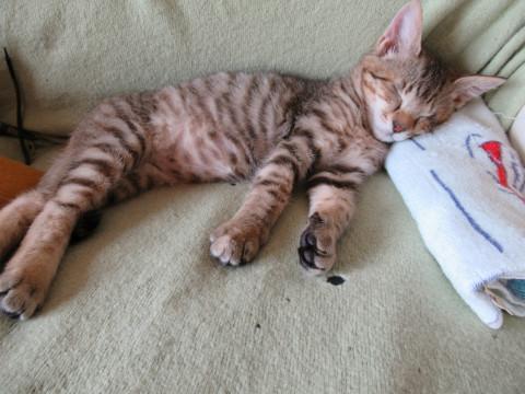 猫風邪を引いたことが原因で、目に障害があります。左目は眼球が委縮しており、今後回復の見込みはありません。右目は幕がかかったようになっており、曇りガラスを通して物を見るような感じだそうです。右目も手術で治る可能性はありますが、何度も幕が張ったような状態を繰り返すとのことです。今のままで、十分に生活はできるので、しばらくこのままで行こうと思っています。現在は目薬を日に3,4回しています。