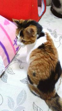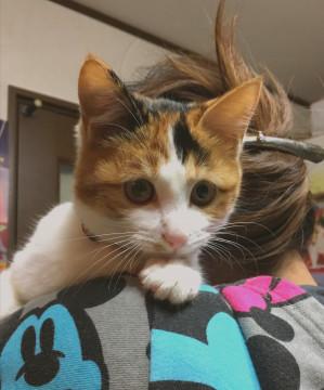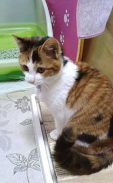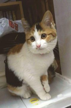 くっきりした色彩のきれいな三毛ちゃんです。人懐っこく、誰にでもすぐに馴れます。抱っこされても嫌がりません。