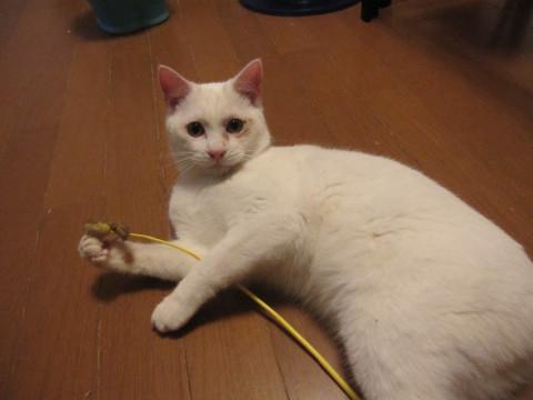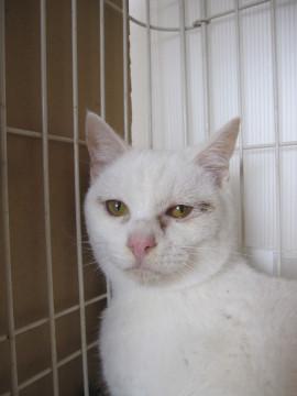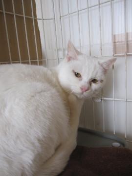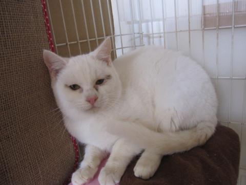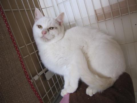 きれいな白猫スケキヨ君、真っ白かと思えば尻尾がやや茶色がかっています。少しびびりさんなので最初はなかなかさわらせてくれませんでしたが、実はごろすりのかまってちゃんだったようです。人の手は未だ少し怖いようですが10日でベタベタ甘えん坊になりました。他の猫ちゃんにも威嚇することなくすぐに仲良くなれました。