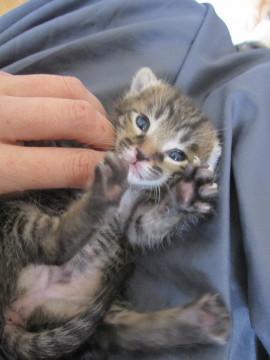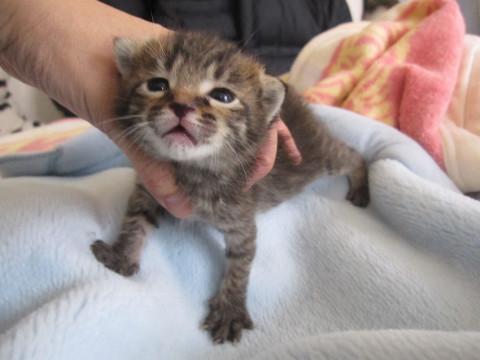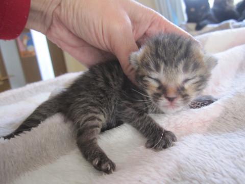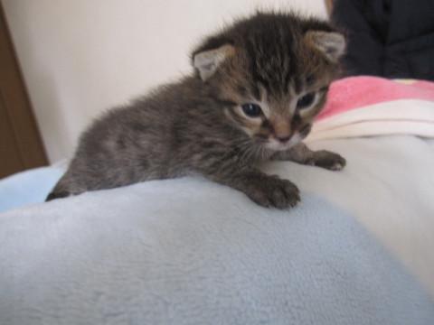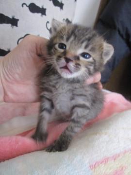 かわいいキジトラの女の子、しおちゃんです。小さいので性格ははっきりわかりませんが、ミルクから育てるので大変人懐こくなります。とても元気で食欲旺盛、寂しがりやです。