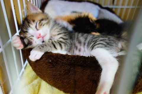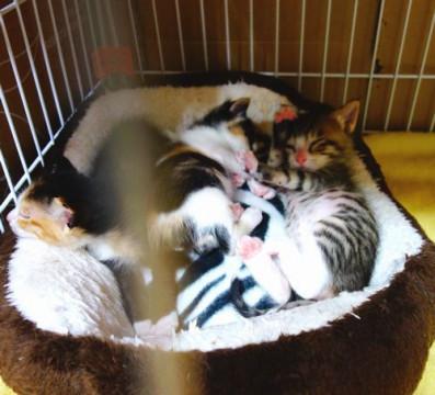 若い初めての出産のお母さん猫は生み落とした後、無関心で全く面倒をみず、他のハウスで昼寝をしていたそうです。