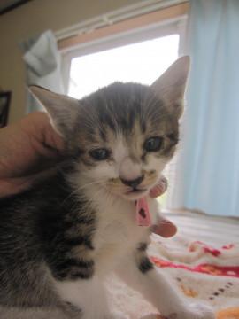 可愛いキジ白、れいちゃんです。優しい顔つきで、兄弟の中では小さいほうですが、大きな兄弟にも負けずに活発に遊びます。大変人なつこく、ずっと見つめてきます。