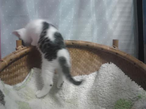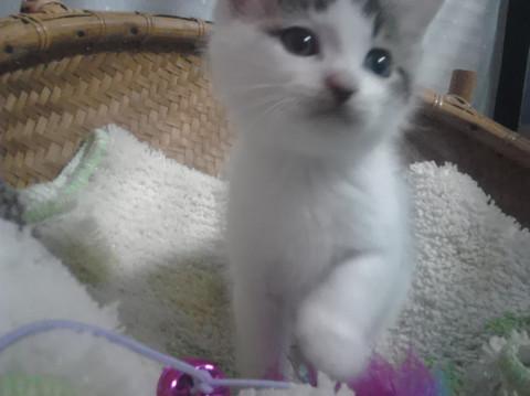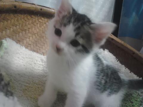 キジ白ですが、白が多いです。尻尾は長く、とても人なつこいです。