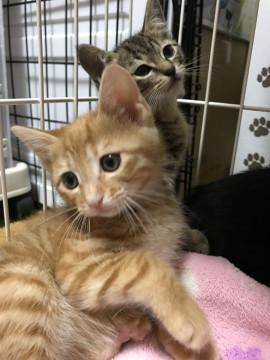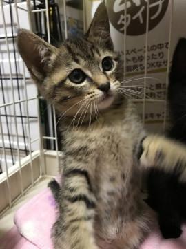 キジトラに丸いヒョウ柄あり、シッポ真っ直ぐ女の子。