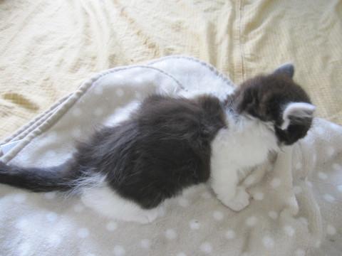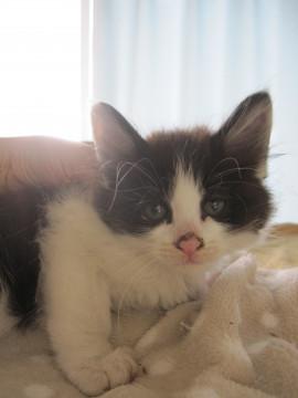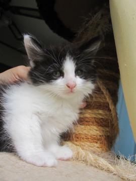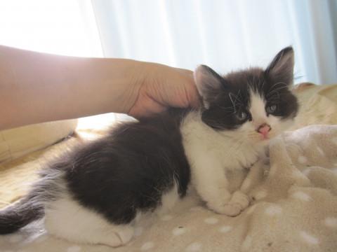 かわいい黒白えいとくくんです。毛足が長いので半長毛かもふもふになると思います。性格は大変人懐こく、活発。他の猫ちゃんともすぐに仲良くなれます。