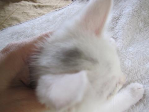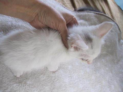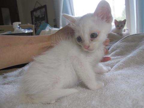 かわいい白猫、ふぁんたちゃんです。頭のグレーのポチ模様がキュート。性格は大変人懐こく、ややおっとりしているかもしれません。