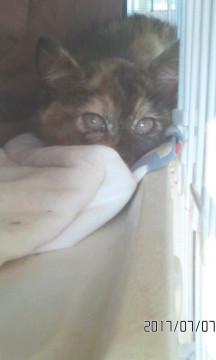 サビ猫 雌 2か月ぐらい。尻尾が短い。 抱っこが大好きでのどを鳴らしいつまでも抱っこしています。