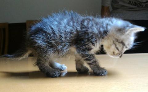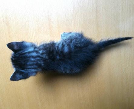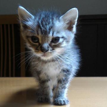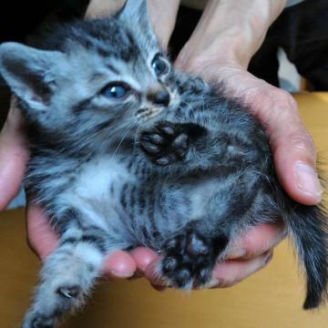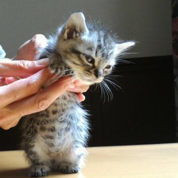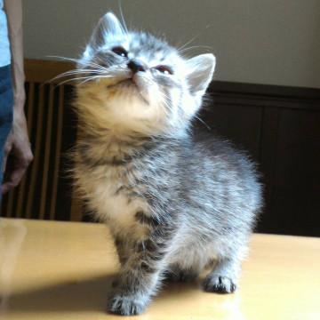 おっとりとした性格のようで、大人しいです。しっぽも長く、とても綺麗なロシアンブルーの様な仔猫です。他の猫とも仲良く暮らしています。