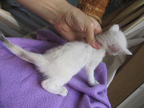 かわいいシャム系ミックス、うらしるちゃんです。目はブルーで、頭や尻尾にうっすらポイントがあります。ポインオは成長するにしたがって濃くなる子が多いです。性格は大変元気で人懐こいです。